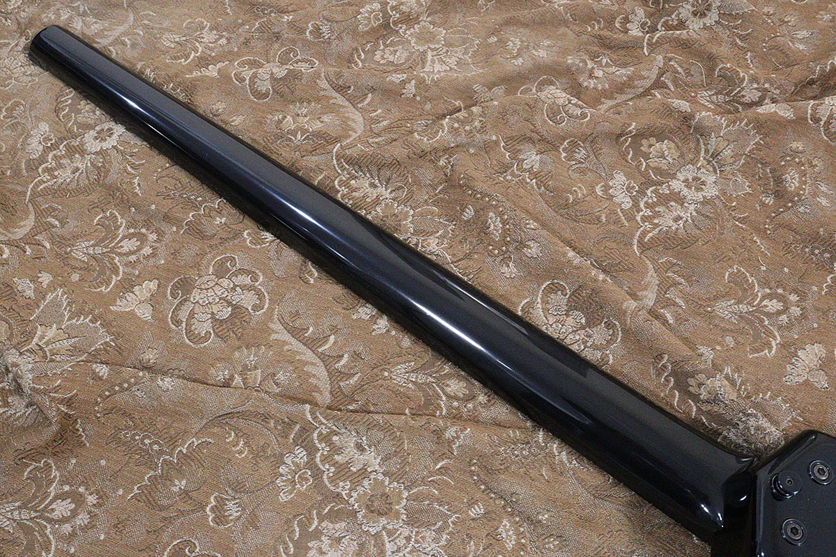 ヘッドレスのカーボングラファイト・ネックを、メイプル材ボディにボルトオン・ジョイントされたモデルです